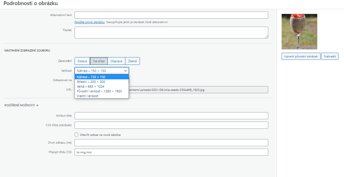 Zde se ukazuje nastavení zobrazovaného souboru, jde o zarovnání, velikost a další. Pokud chcete obrázek větší, zvolte velký případně původní velikost. Více o nastavení obrázku najdete zde.