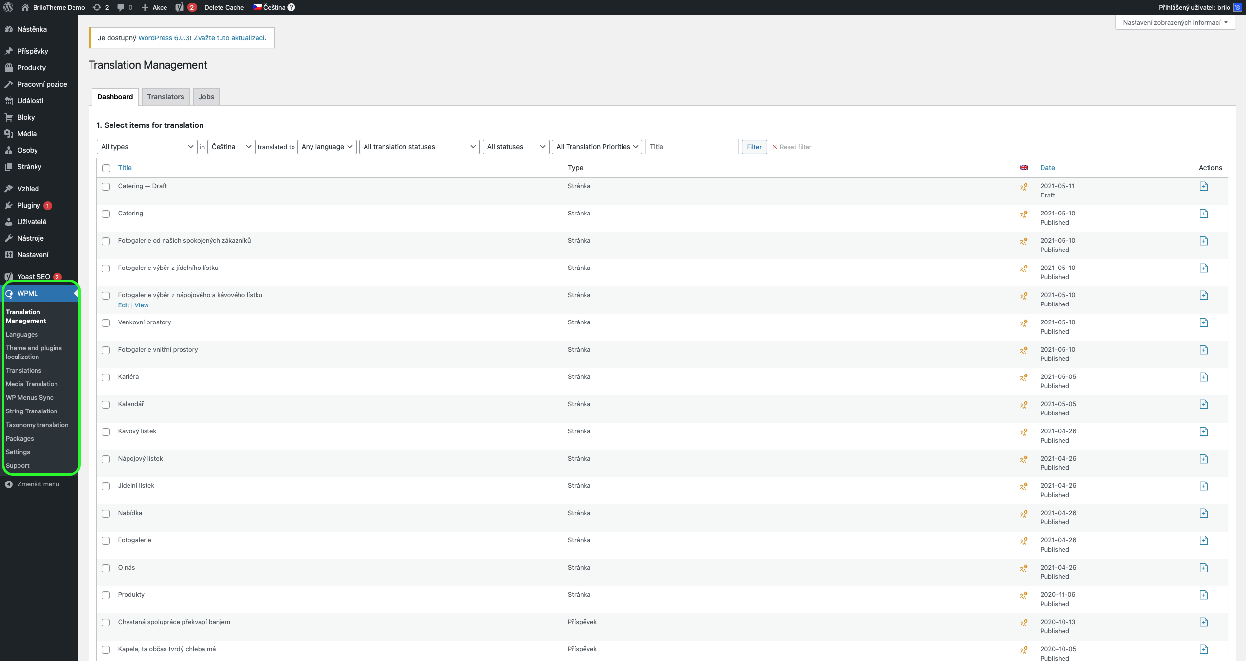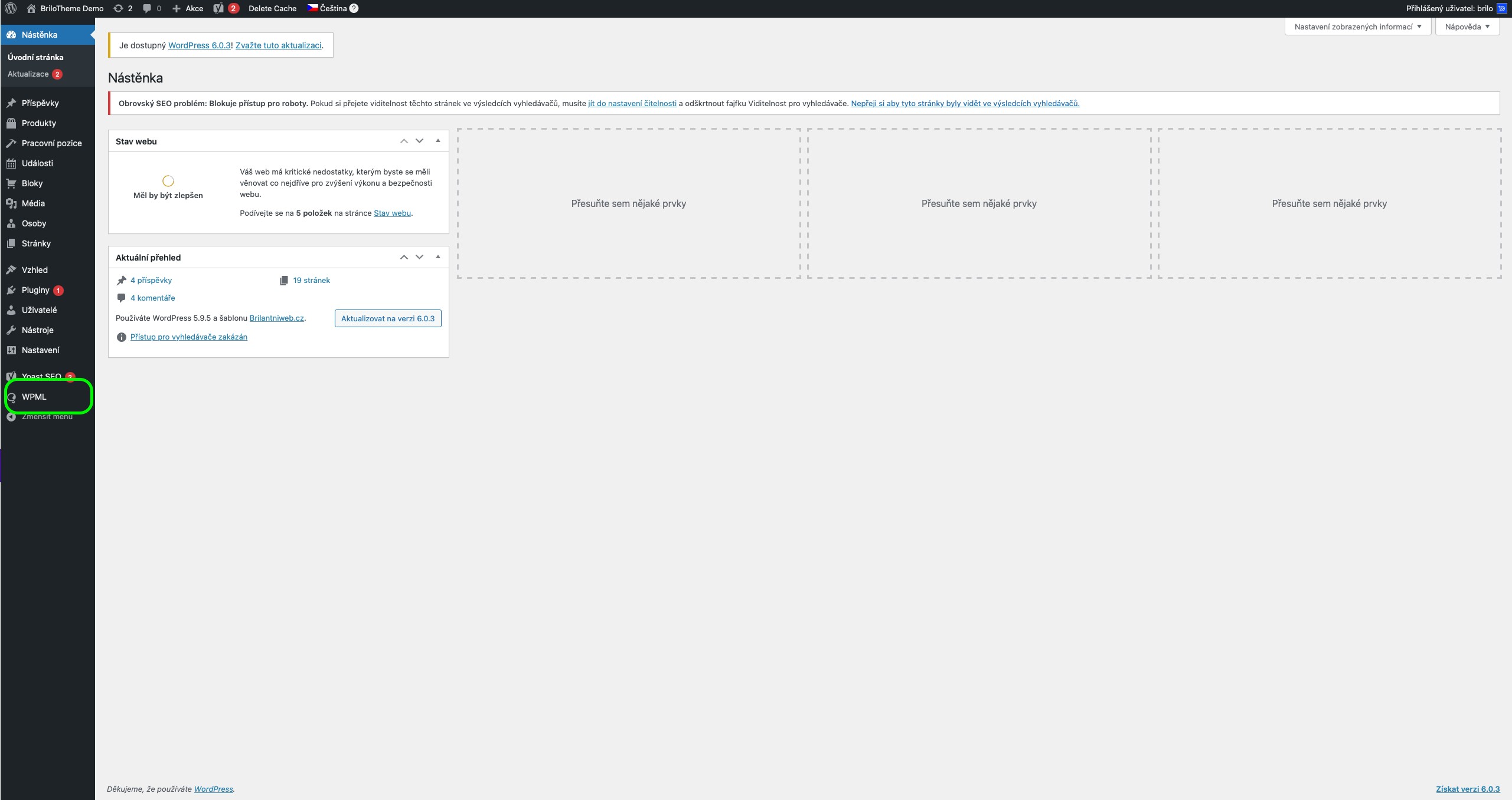 Po přidání pluginu WPML se vám zobrazí nový odkaz na konci levého, tedy černého, menu.