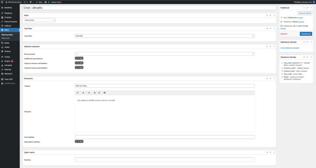 - Rubriky –vyberte, které rubriky chcete, aby se zobrazovaly v tomto bloku.