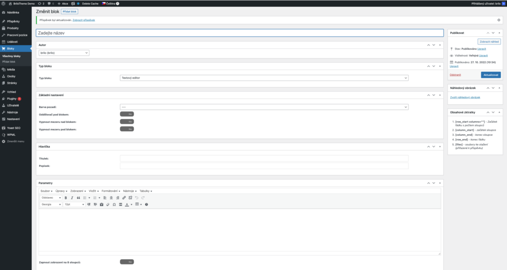 - Parametry – slouží k vložení obsahu a nabízí vlastnosti jako typografická úprava pomocí editoru Wysiwyg. Více informací najdete na stránce zde).
