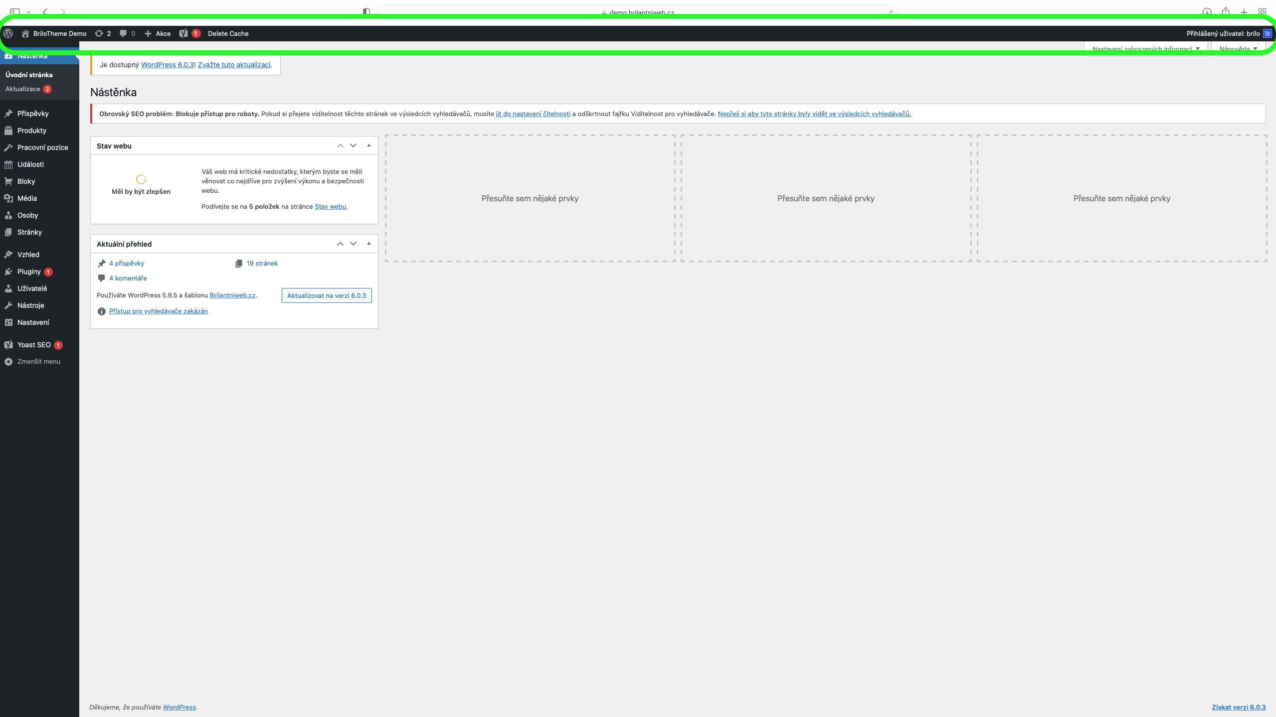 - Aktualizace WordPress – zde najdete informace o aktualizacích, nastavení automatických aktualizací a zjistíte, jaké pluginy nebo šablony je třeba aktualizovat.