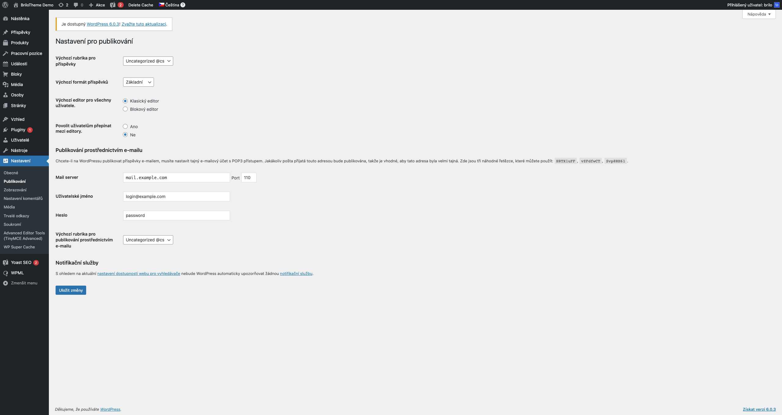 Nastavení publikování obsahuje několik možností souvisejících s obsahem webové stránky. Zde si můžete vybrat výchozí kategorii a formát pro články a také možnost publikování článků prostřednictvím e-mailu. Pro uložení provedených změn klikněte na tlačítko „Uložit změny„.
