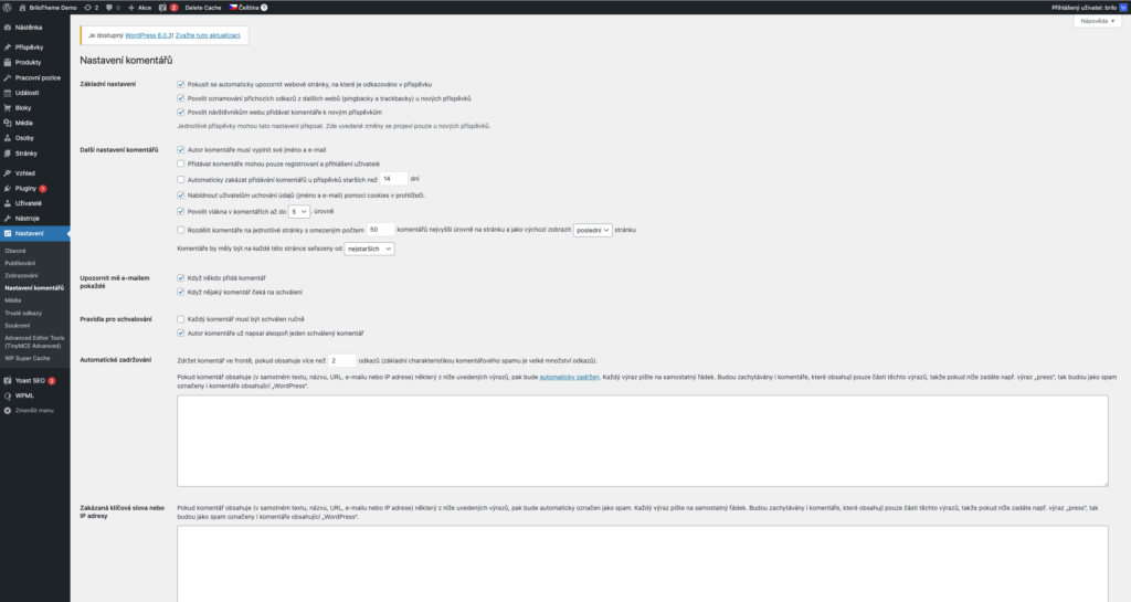 V nastavení komentářů můžete také vybrat možnosti, jako je upozornění e-mailem na nové komentáře, schvalování komentářů před zobrazením na stránce a černá listina slov pro komentáře.