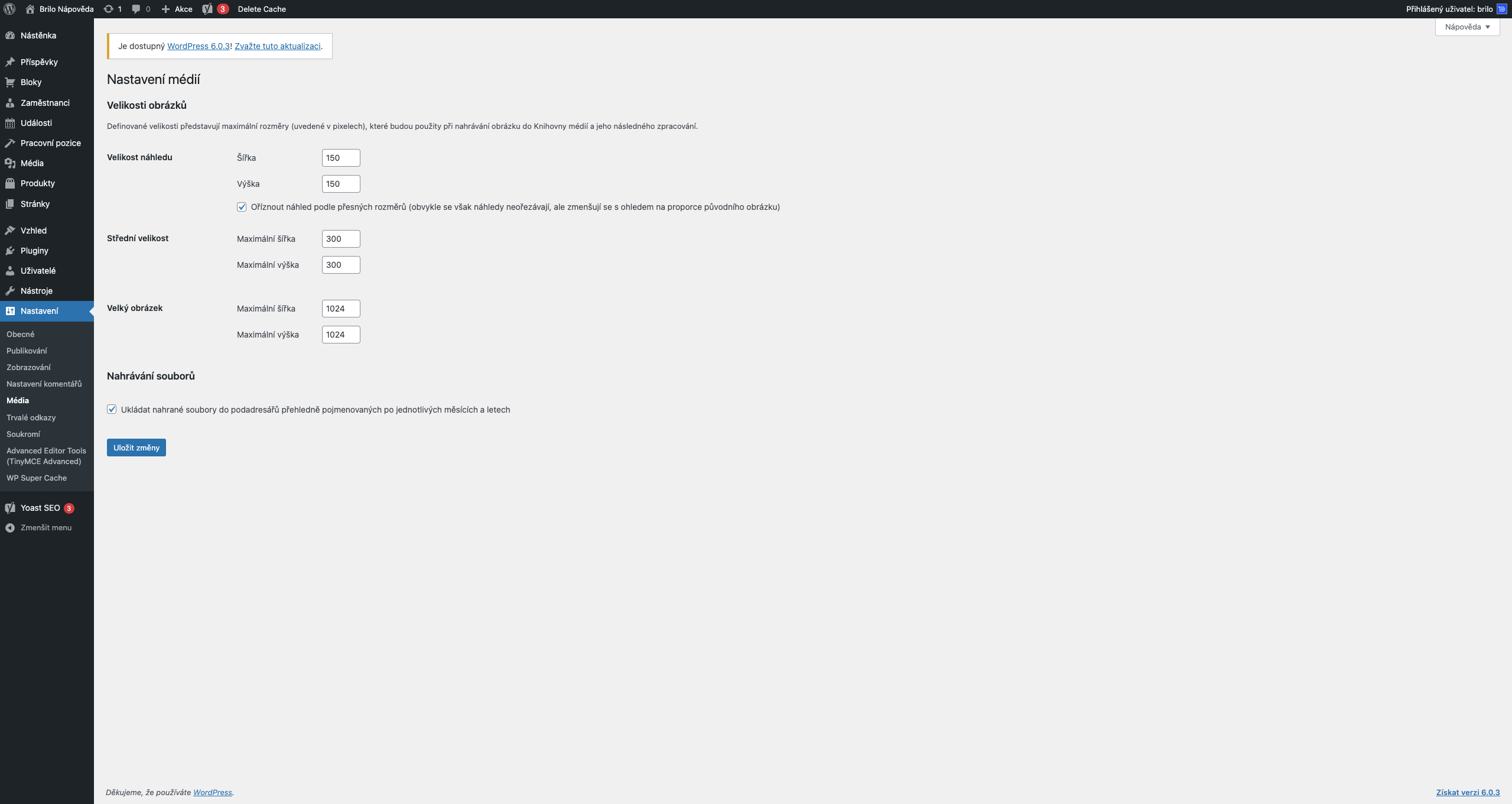 V nastavení médií můžete zvolit velikost obrázku, který se vytvoří při nahrání na stránku. Můžete nastavit velikost miniatury, středního a velkého rozměru obrázku.