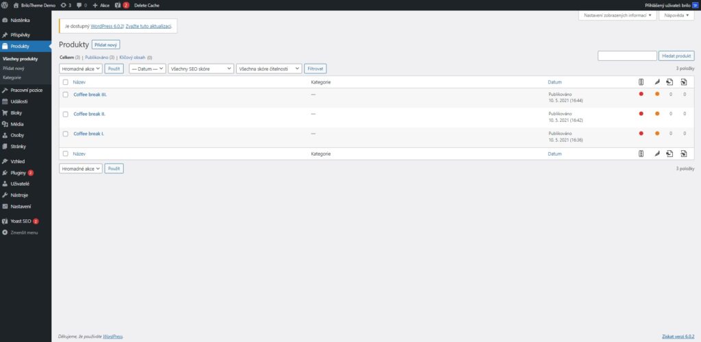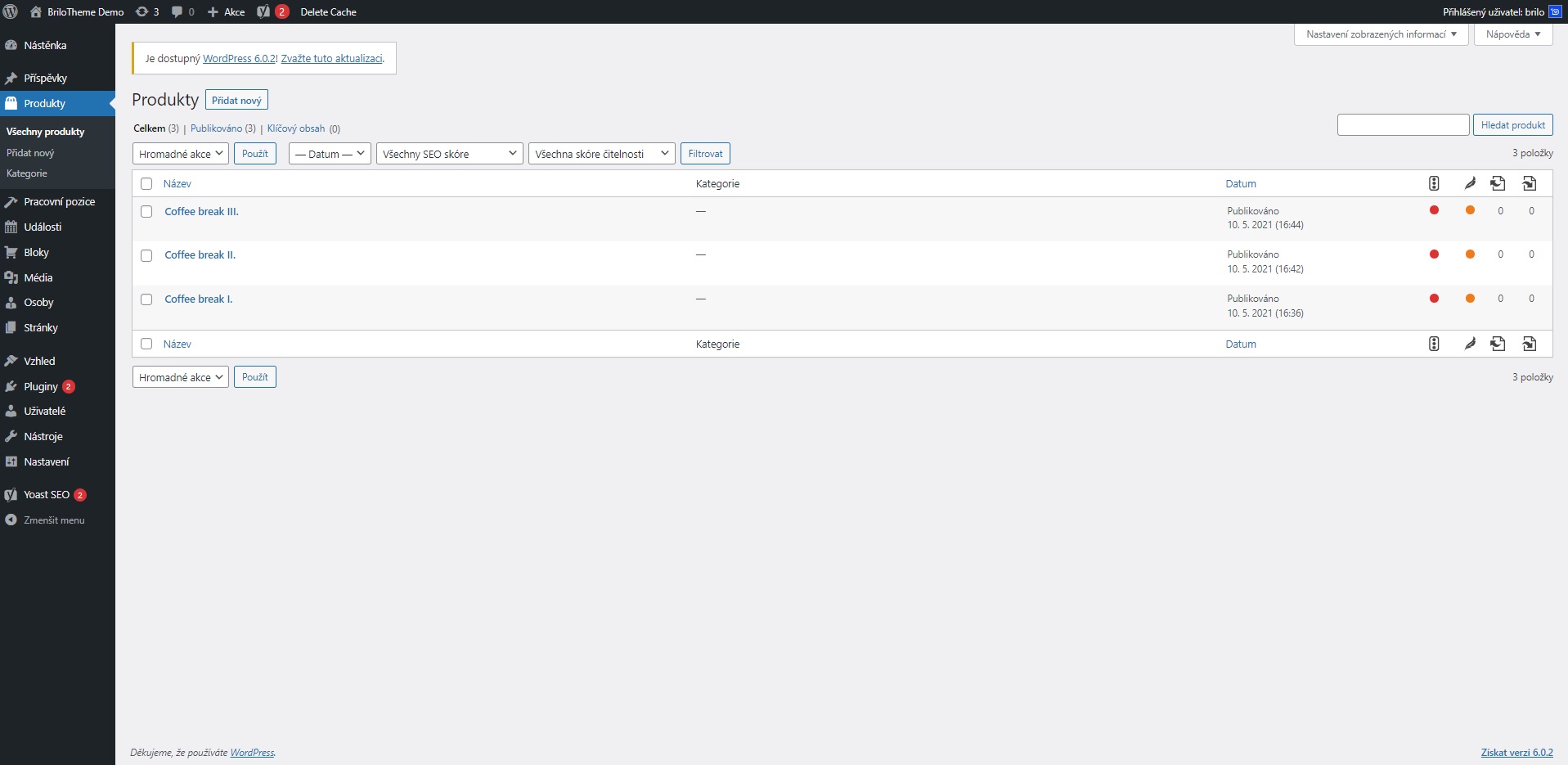 V levém černém menu po kliknutí na „Produkty“ se načte seznam všech produktů, který zobrazuje „Všechny produkty„. Můžete je editovat jednotlivě nebo hromadně pomocí označení jednotlivých produktů (úprava/odstranění).