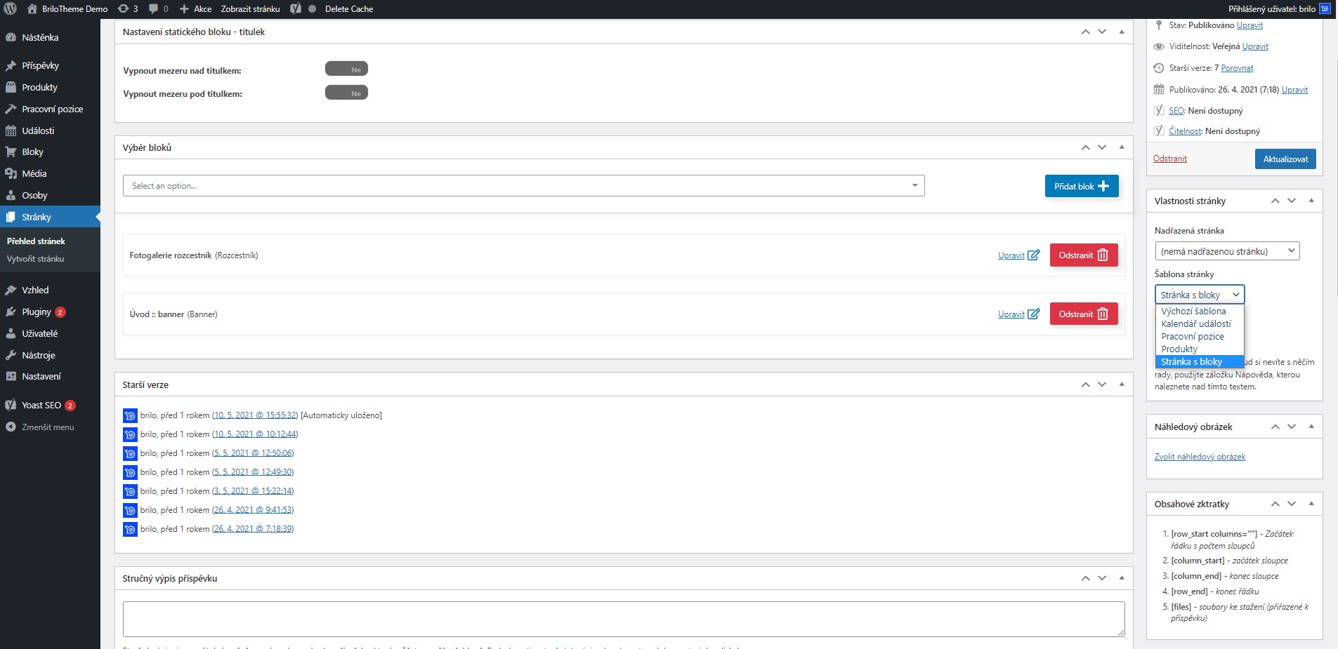 Během tvorby stránky je možné změnit její typ. Pokud jste začali vytvářet stránku s výchozí šablonou (typografická stránka) a později zjistíte, že potřebujete změnit na stránku s bloky, postupujte následovně: v nabídce v pravém bočním menu editoru stránky přejděte do Nastavení šablony a přepněte na stránku s bloky. Poté ji publikujte. Obsah, který jste již vložili do typografické stránky, zůstane zachován.